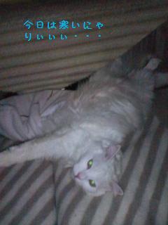 × [PR]上記の広告は3ヶ月以上新規記事投稿のないブログに表示されています。新しい記事を書く事で広告が消えます。 今日も昨日の雪の影響か寒かった・・・。 この寒い中、俺様は閉じ込められた・・・。 その後鬼は、 「さぶかったらぁ~炬燵にでも あたってろしぃぃぃ・・・。」 だって、ひどすぎる・・・。 ← こたつの中で怒ってる俺様!! 今日一日ご機嫌斜めのレオ君でした・・・。 ごめんねぇ・・・。