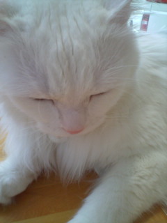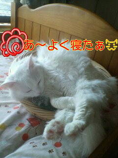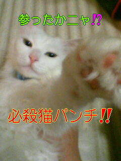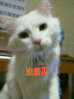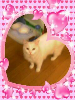 俺様は、男だ!!!手術はされているが・・・男だ!!! なぜこんなことを書くかというと・・・。 本日我が家にきた訪問者が 「かわいい、ねこちゃん!!!真っ白だし・・・。 おめめぱっちりでかわいい!!!」 だろ・・・。おれさまはとびきりかっこいいだろ!!! といつものように気どってとびきりのいい声で「にゃーーーン」 ですりすり!!! そしたら、そいつは 「かわいいと思ったら女の子なんだぁ・・・。」 ???← 俺様の頭ん中・・・。 「赤ちゃんお腹にいるんだぁ・・・。」 あゆちゃん:「わっっはっはは!!!!お腹出てるけど 赤ちゃんじゃないよ(*^_^*) メ・タ・ボ なだけ! 一応男の子だし・・・。」 レオ君 :「メタボで悪かったなメタボで!!! どうせ腹がぶよぶよですよ!!! それに、一応じゃなくて男です!!!男」 あゆちゃん:「でも、この写真見るとやっぱり女の子っぽいよ!! せっかくかわいいんだから女の子ってことに しといたら??」 レオ君 :「絶対ヤダ!!!」 このフレームはやめてくれ!! 女くさい・・・。 俺様に注目!!! うん、俺様カッコイイ!!! 鬼(あゆママ):「ちょっと可愛いって 誉められたかって調子に乗るんじゃないの!!」 でも・・・。一番調子に乗ってるのはママだと思うよ・・・。 by あゆ